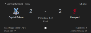 ผลการแข่งขัน : คริสตัล พาเลซ 2(3)-2(2) ลิเวอร์พูล