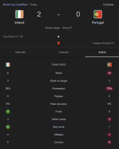 ผลการแข่งขัน : ไอร์แลนด์ 2-0 โปรตุเกส