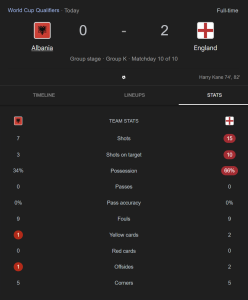 ผลการแข่งขัน : แอลเบเนีย 0-2 อังกฤษ